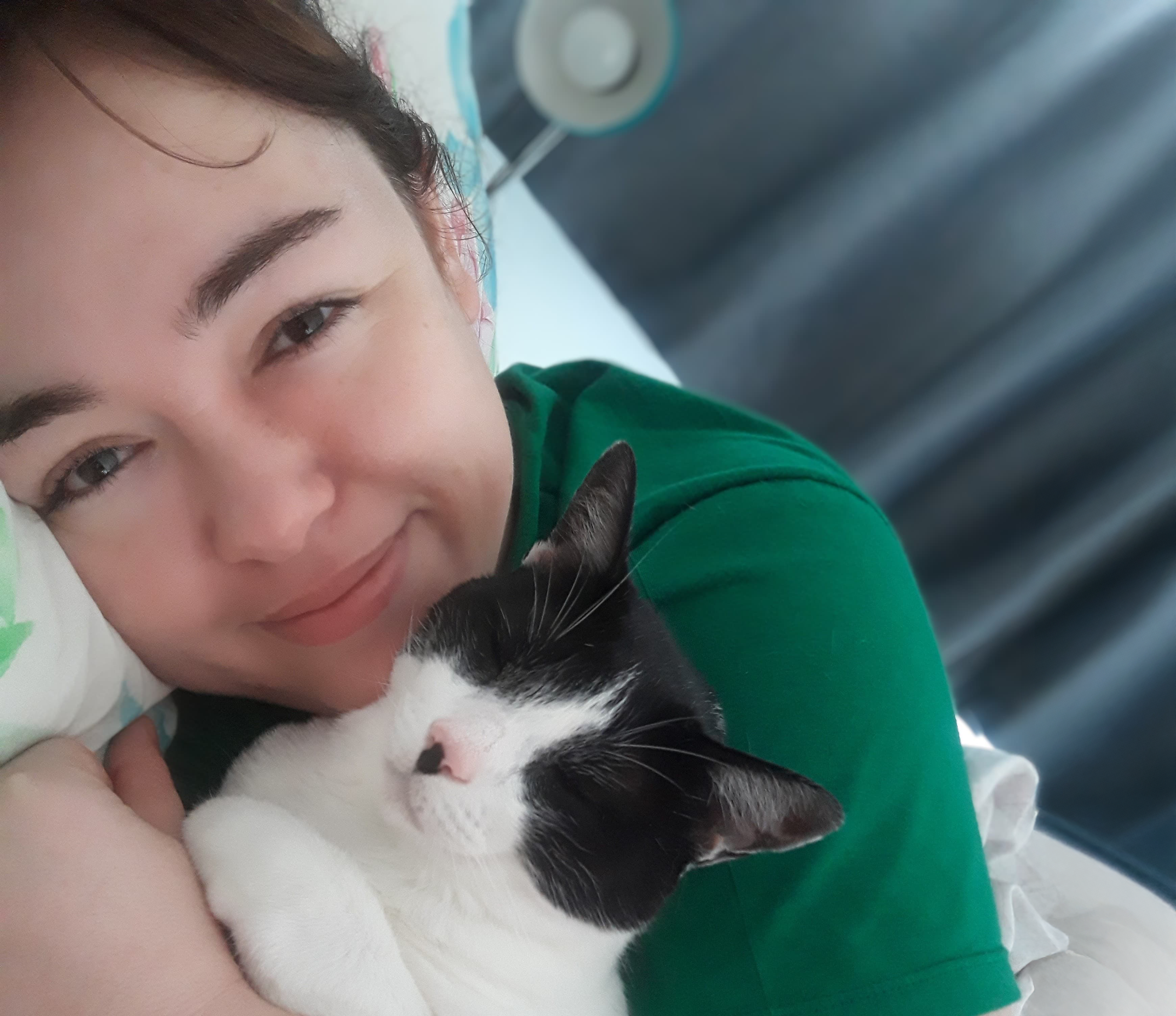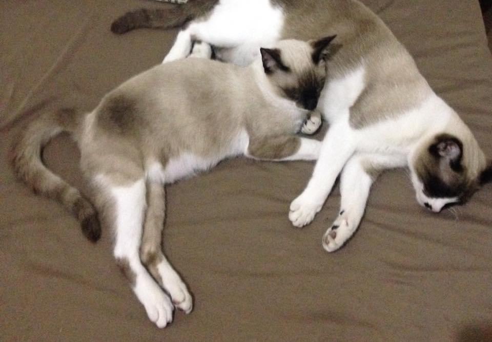 That wasn’t the end of her journey. When she married and moved into a new home, Carolina adopted two cats — Mel and Meg, a mother and daughter. Their personalities quickly filled the house with affection, and they, too, earned a place in her heart — and on her leg.